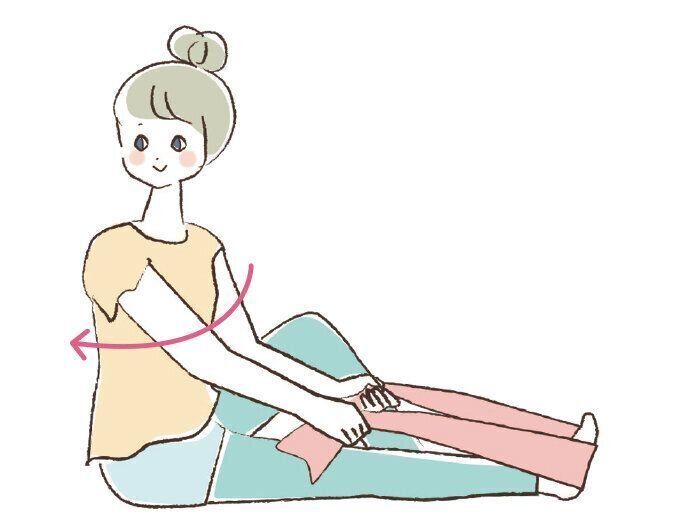 (5)腰と背中をまっすぐ伸ばしたまま、上半身を右にひねって5秒間キープ。このとき、子宮が正面を向いていることを意識するとGOOD。足を変えて(4)〜(5)を数回繰り返す