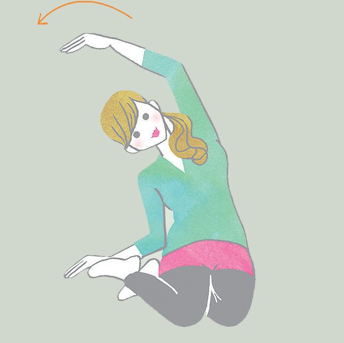 3 1の脚を逆にして、左腕を耳の横まで上げ、息を吐きながら右へ倒す。よく伸ばして元のポジションにゆっくり戻す。左右を比べてつらいほうをもう1度行い、バランスを整える。