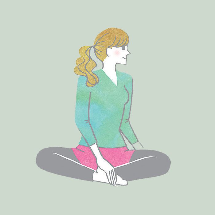 4 あぐら座になり、息を吐きながら左右にひねって体を緩める。
