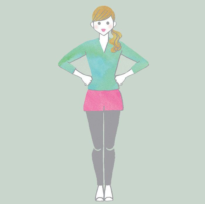 1 両手を腰にあててひざを軽く曲げて立つ。その後右足に重心をかけて左足を横にゆっくりと、約5秒かけて開く。