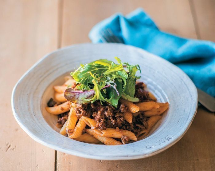 (2)フライパンにオリーブ油と赤唐辛子を中火で熱し、玉ねぎとセロリを炒める。しんなりしたらひき肉とレバーを加えて炒める。肉の色が変わったら、赤ワインを加えてアルコール分を煮とばし、ホールトマトとローリエ、塩、こしょうを加える。ときどき木べらで混ぜながら、水分がほぼなくなるまで10分ほど煮る。