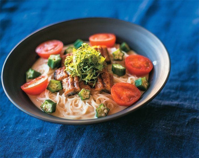 (1) うなぎは食べやすい大きさに切る。オクラは塩をふってまな板で板ずりし、熱湯で2分ほどゆでて幅1cmに切る。ミニトマトはへたを取って横半分に切る。青じそはせん切りにする。豆乳とめんつゆを混ぜておく。