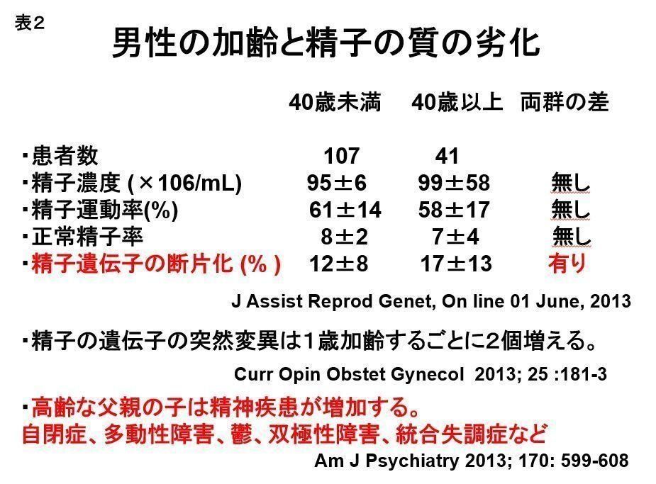 ここからは、遺伝子に関する少し難しい話になります。精子それ自体に起こる年齢による「質」の低下は、精子遺伝子の断片化とポイントミューテーションが考えられています(表2)。