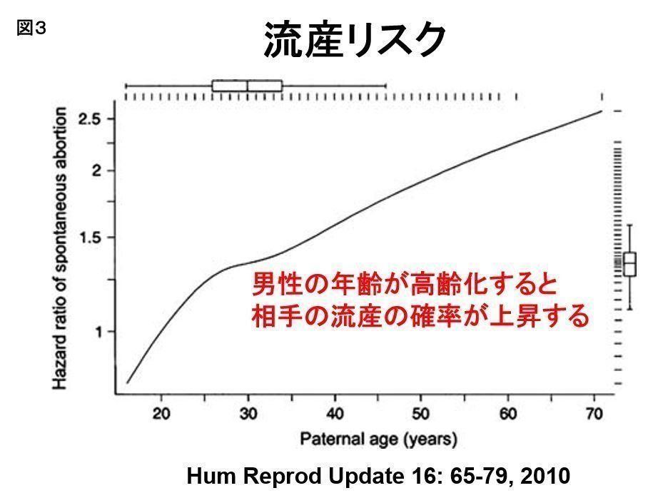 男性の年齢が上がるとともに、妊娠した相手の流産リスクも上昇します。女性の加齢でも流産リスクは上昇しますが、それを補正しても、男性の年齢だけでも上昇するということがわかっているのです。