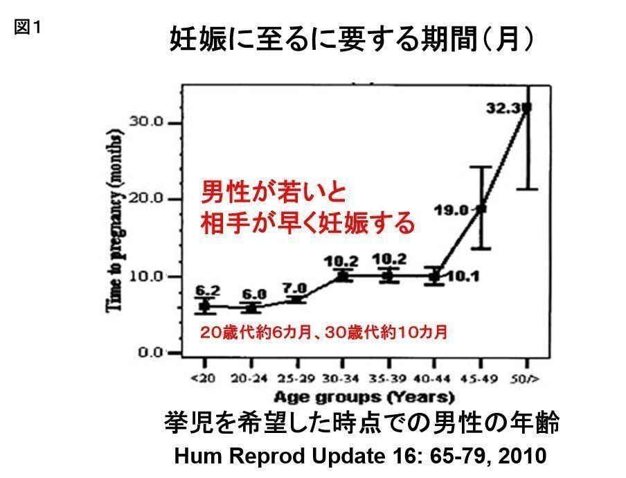 図1を見てください。このグラフは男性の年齢を横軸にとり、妊娠を試みてから相手の方が妊娠に至るまでの期間を示したグラフです。男性の年齢が20代までは、約6か月で相手の方が妊娠しますが、30代から40代前半だと、相手の方が妊娠するまでの期間は約10か月かかります。