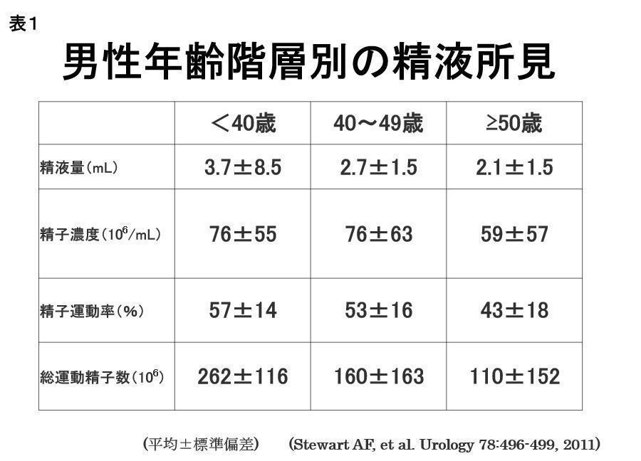 まず、男性の検査で最初に行われる精液検査の年齢による影響をお話ししましょう。精液検査では、精液量、精子濃度、精子運動率、精子奇形率、などが一般的に検査されています。表1は数ある報告の一つです。