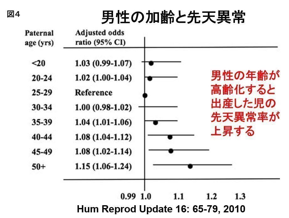 出生児の先天異常のリスクも、女性の加齢と深く関わっていますが、その影響を補正して検討したのが、図4になります。男性の年齢25歳から29歳を対照として、各年齢のグループと比較しています。