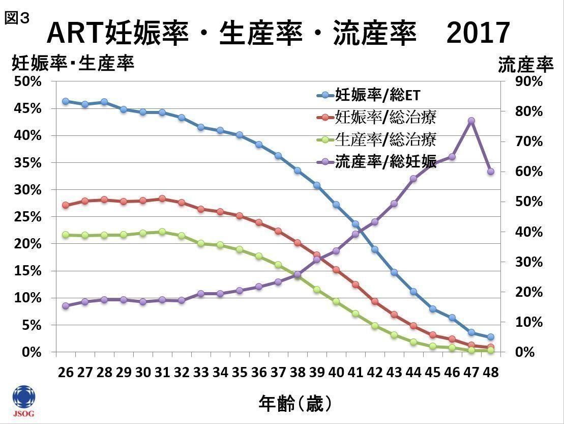 図3は2017年ART治療※の年齢別成績結果です。毎年、各年齢のグラフを作成していますが、その数値は毎年ほとんど同じで、妊娠率・生産率は、年齢とともに低下します。