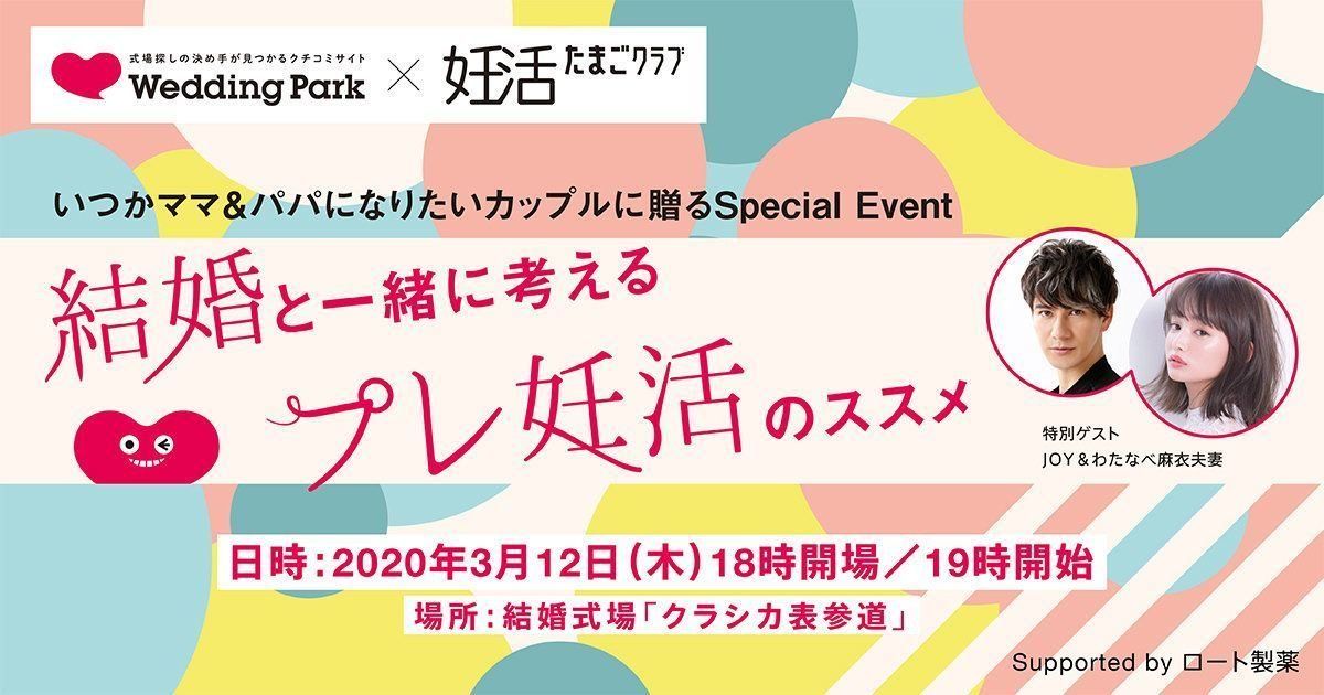 今回は妊活を応援するメディア「たまひよの妊活たまごクラブ」と国内最大級の結婚準備クチコミ情報サイト「ウエディングパーク」、そして、パパになりたい、ママになりたいという想うカップルに届けることが出来るよう、様々な活動を行っている「ロート製薬」の3社で、結婚と一緒にプレ妊活を考えるイベントを開催します。