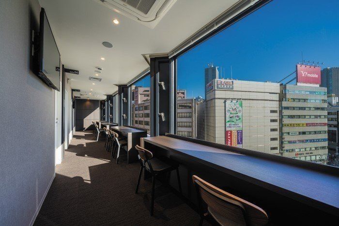 フロアの大きな窓沿いに設置されたカフェのような待合スペース。パソコンを広げて仕事をすることも可能