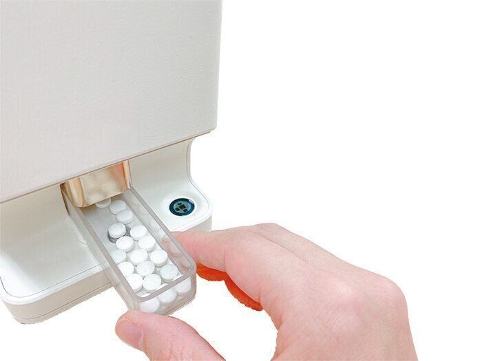 測定後、サプリを自動で組み合わせて抽出。サプリは5mmと小さく、飲みやすい。サーバーは最大8本のカートリッジがセット可能。