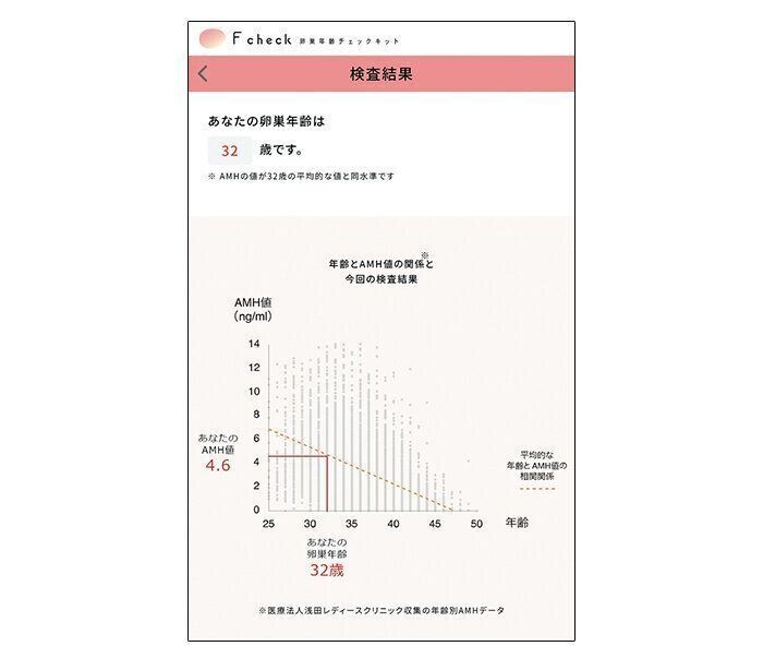 卵子の数の目安となる卵巣予備機能が何歳相当かを表す卵巣年齢を、自分で測定できる日本初の検査キット。