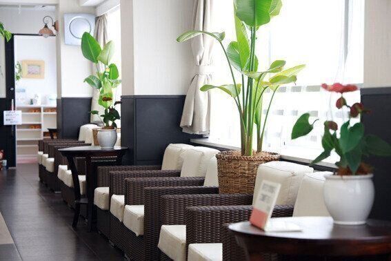 待合室には、自然素材を生かしたソファや、ところどころにグリーンや花が配置され、リゾートホテルを訪れたかのような気分に。プライバシーを重視して、名前は呼ばず、すべてポケベルでの呼び出しで診療が進みます。