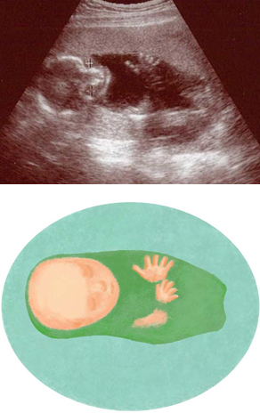 頭のまわりの白い線は、頭蓋骨に当たります。指1本1本が、関節ごとにくっきり。赤ちゃんは普段手を握っていることが多いので、手の断面は丸く写ることが多いでしょう。