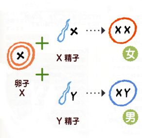 赤ちゃんの性別は受精した瞬間に決まります。卵子と精子には性別を決める遺伝子が詰まった染色体があり、それぞれ卵子には女の子の染色体であるX染色体、精子には女の子の染色体であるX染色体と男の子の染色体であるY染色体をもった2種類があります。腟内に放出された精子が卵子の待つ卵管膨大部をめざして進み、X染色体の精子、Y染色体の精子、どちらの精子が卵子と出会い、受精したかによって、おなかの赤ちゃんが女の子か男の子かが決まるのです。