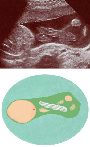 中央に見えるのはへその緒です。血管は見えませんが、コラーゲン組織のよじれがくっきり写っています。成長するにつれ、へその緒は太くなりますが、長さと太さには個人差があります。