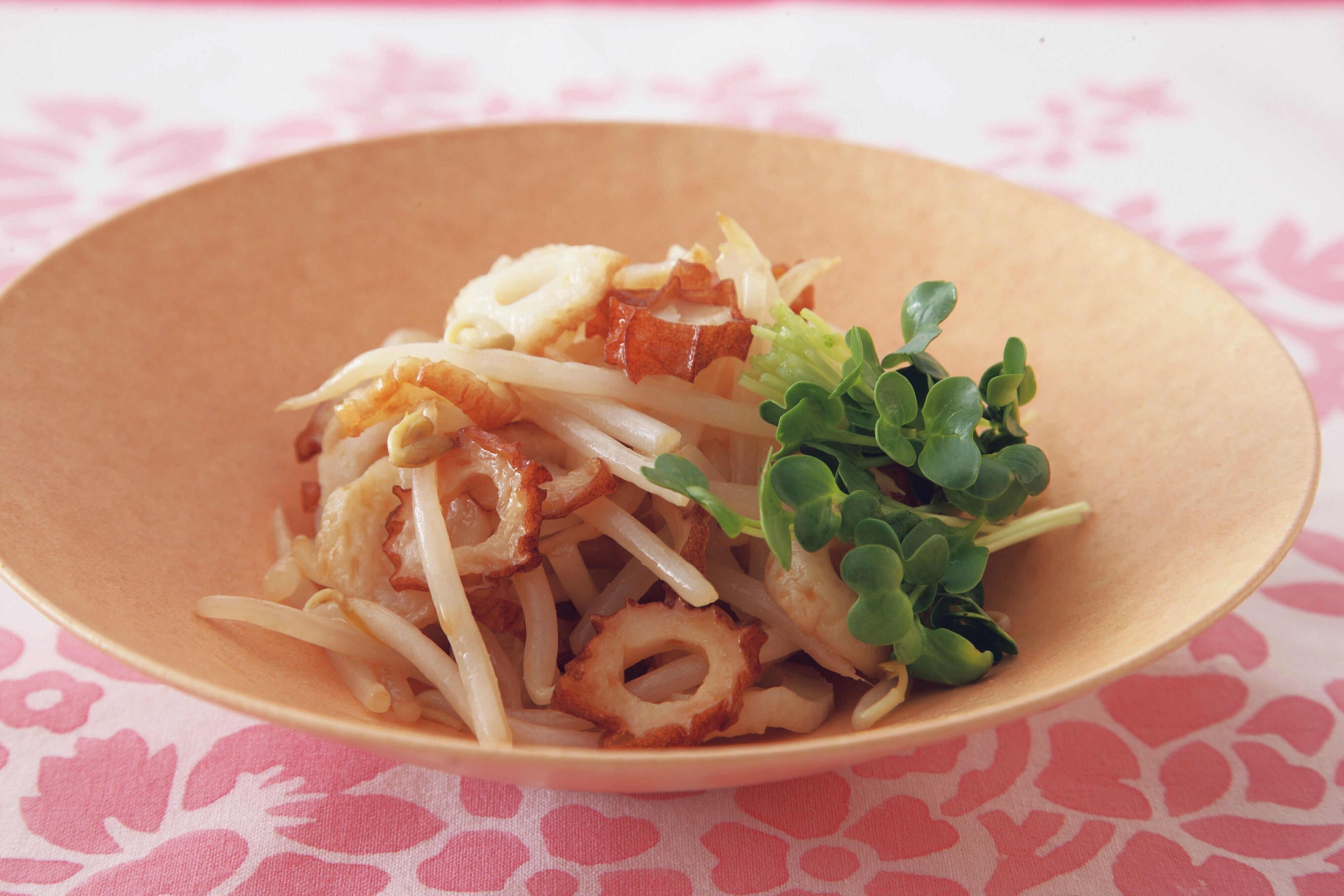 (1)洗ったもやし、小口切りにしたちくわを耐熱ボウルに入れ、ラップをかけて600Wの電子レンジで2分半くらい加熱し、粗熱が取れたら水けを絞る。
