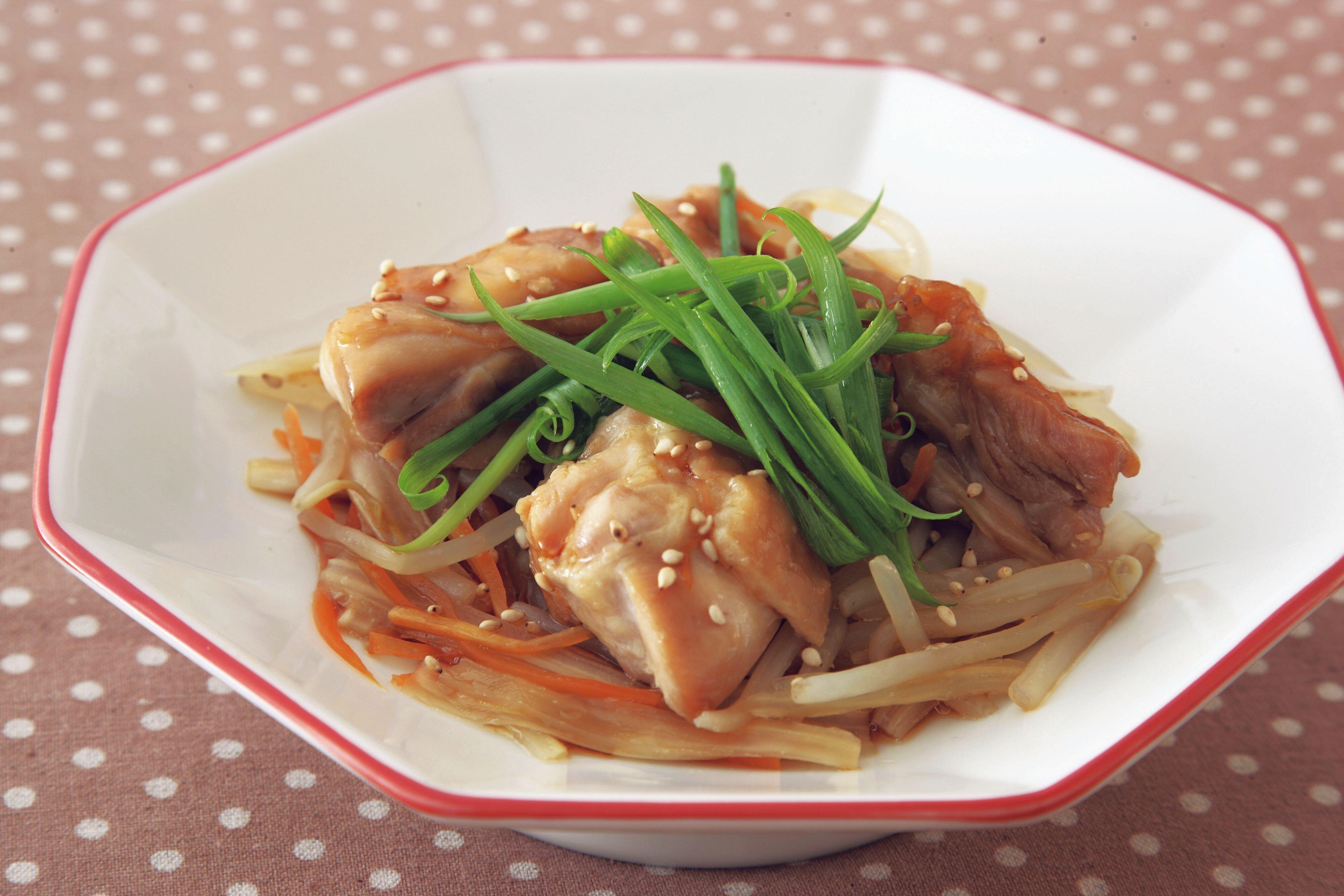 味つけして冷凍しておいた鶏もも肉を使って、電子レンジで手早く調理するメニューです。