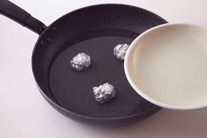 1 アルミホイルをボール状に丸めたものを3 個作り、フライパンに並べる。
