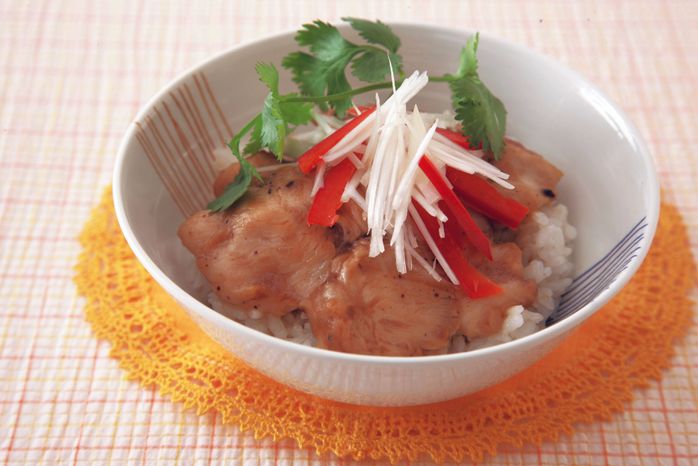 (2) 器にごはんを盛り、(1)をのせ、Bを合わせてかける。