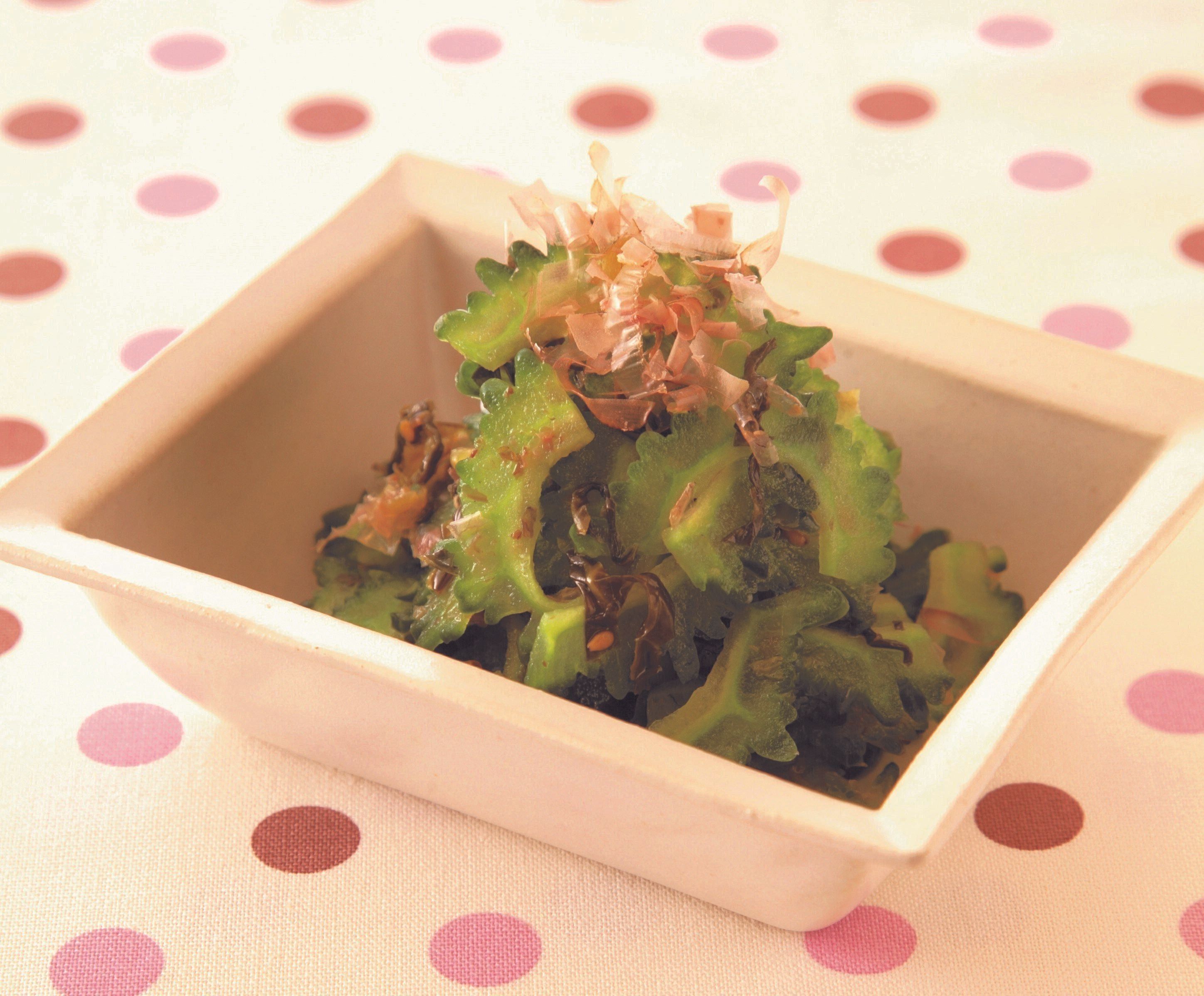(2)塩適宜(分量外)を入れて沸騰した湯の中にゴーヤを入れてサッとくぐらせて水けをきる。ゴーヤと高菜、Aを混ぜ、削り節をかける。