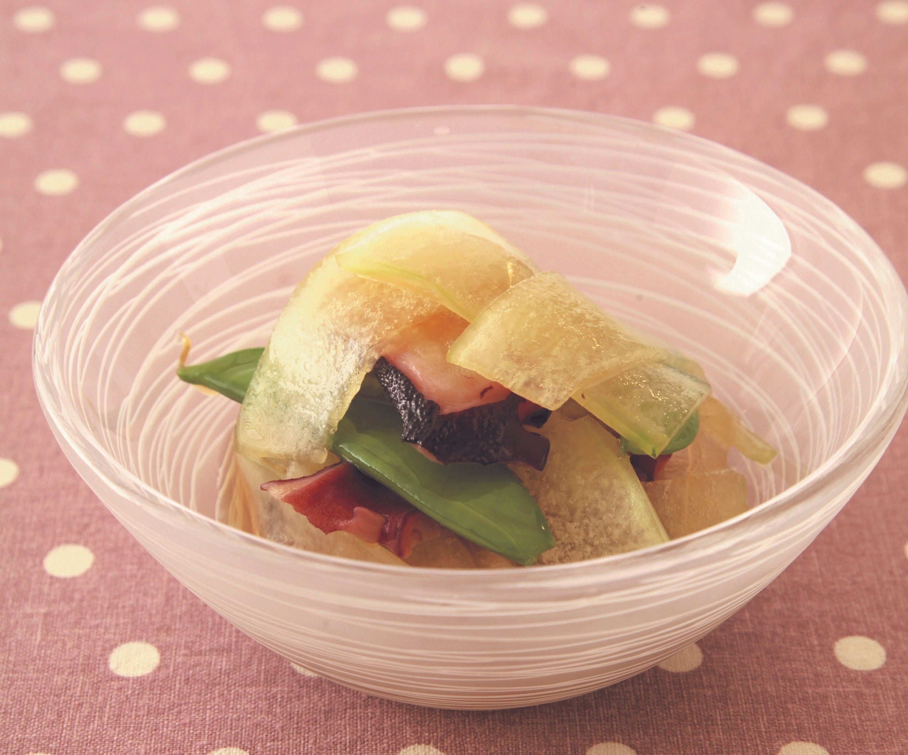 (1)冬瓜は薄切りにして塩少々(分量外)をふりしんなりさせ、水けを絞る。さやえんどうはすじを取り熱湯でサッとゆで水に取り水けをきる。