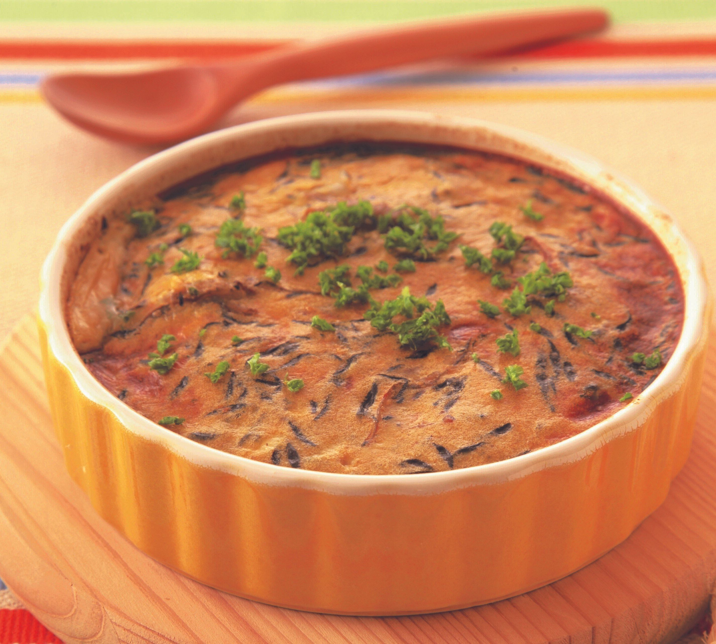 (3)ボウルに、溶いた卵とみそを合わせてよく混ぜ、チーズを散らす。(2)を加えたら耐熱容器に入れ、オーブントースターでこんがりとなるまで焼き、パセリのみじん切りを散らす。