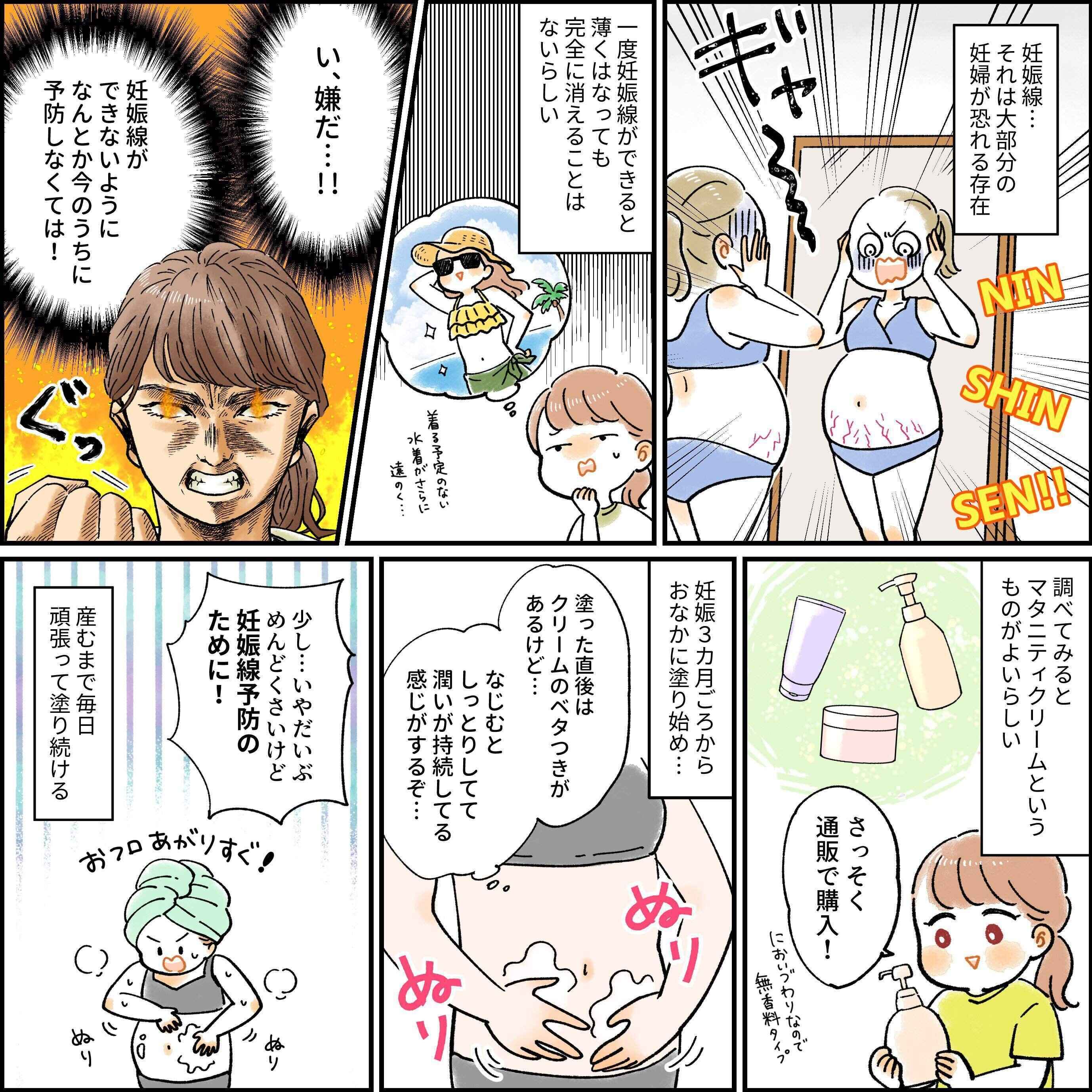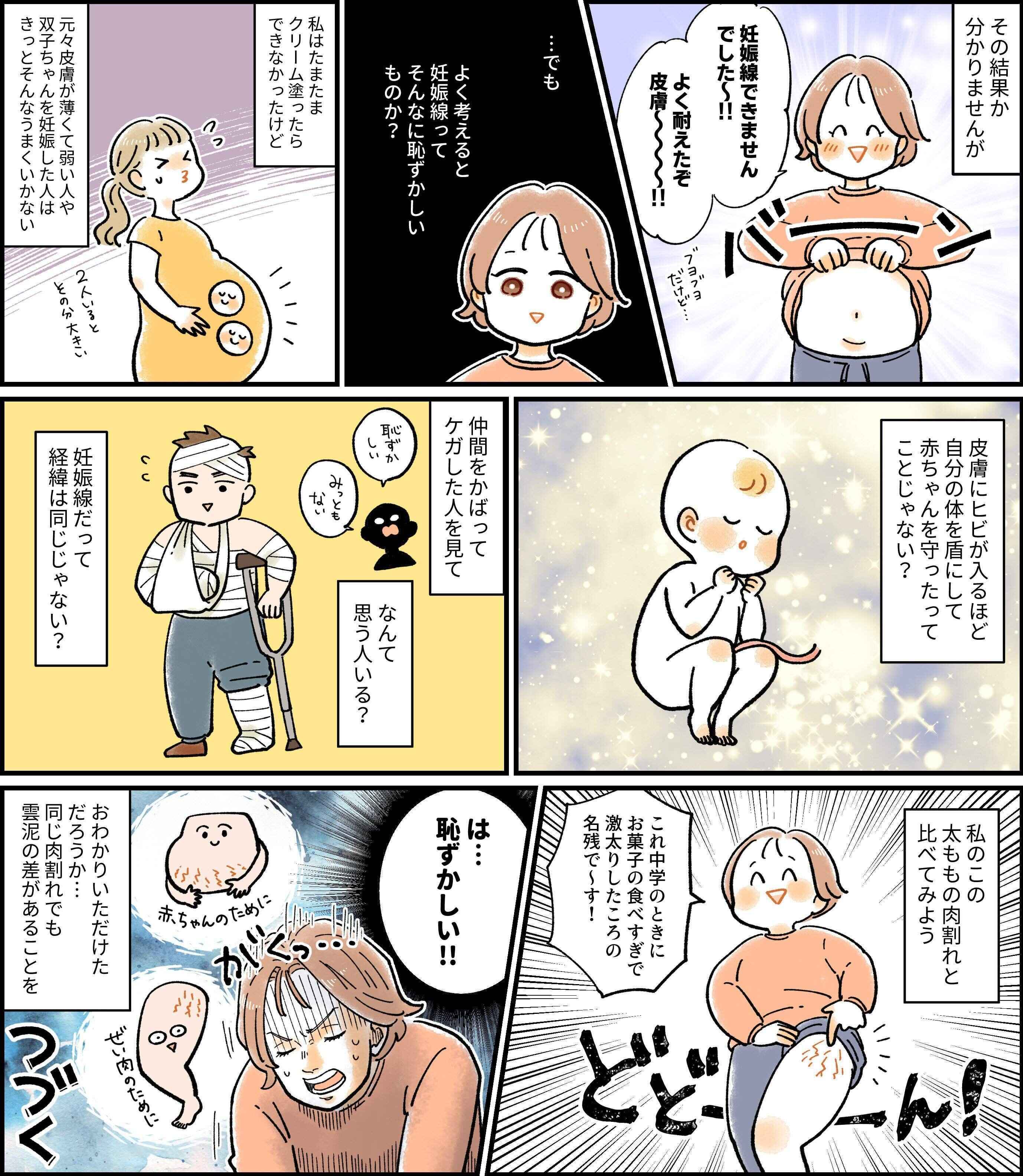 看護師でイラストレーターのぽぽこさんによる連載まんが「めくるめくニンプの世界」。第6回は妊娠線について。妊娠線予防のケアを頑張ったぽぽこさん。でも考えてみると妊娠線は赤ちゃんを守った証と言えるのかも…。