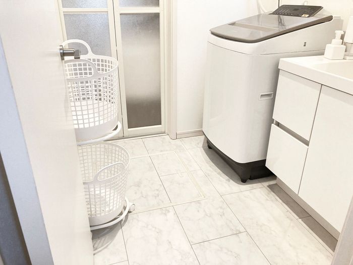 決して広くない洗面所ですが、できる限り清潔でゆとりのある空間にするために、ランドリーバスケットや収納用品は、キャスターが付いた動かせるアイテムを選びましょう。