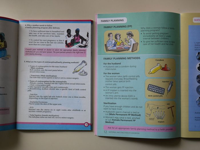 避妊や家族計画などの性に関する保健サービスを、具体的に母子手帳に書いている国もあります。左/カメルーンの英語版母子手帳、右/インドネシアで特別に作った英語版母子手帳。