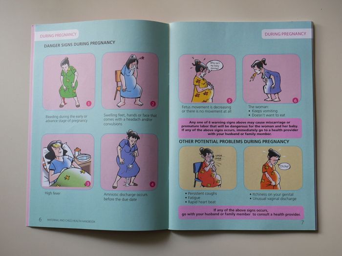インドネシアの母子手帳では、妊婦が危険なサインをすぐ理解できるように、イラストをメインにして説明。