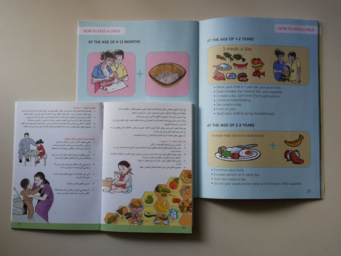 母乳と普通食の間をつなぐ「補完食」の与え方について、イラストをたくさん使って説明。左/パレスチナの母子手帳。右/インドネシアの英語版母子手帳。