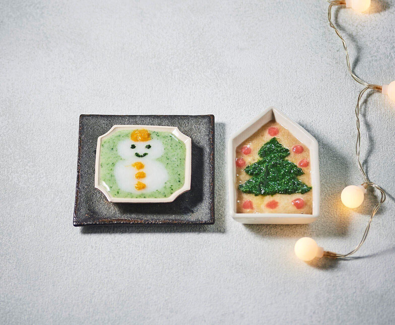 おかゆでスノーマン、葉物野菜のペーストでクリスマスツリーに