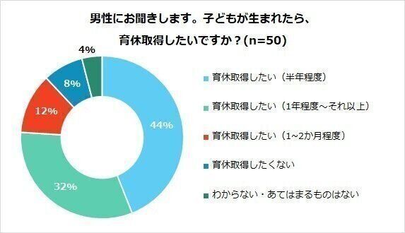 驚いたのは、男性側が希望する育休期間の長さです。「半年程度」が最も多く44%。全体の32%の人が「1年程度~それ以上」と回答しています。