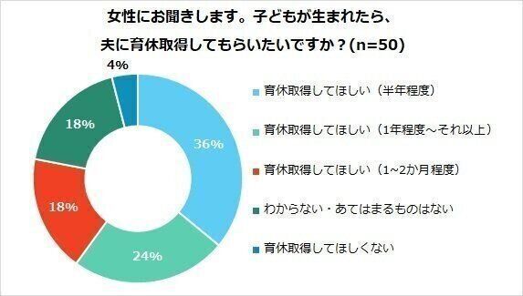 約8割の女性が「育休取得してほしい」と考えていることがわかりました。女性側も、男性が育休取得を一般的なこととして捉えていることがうかがえました。