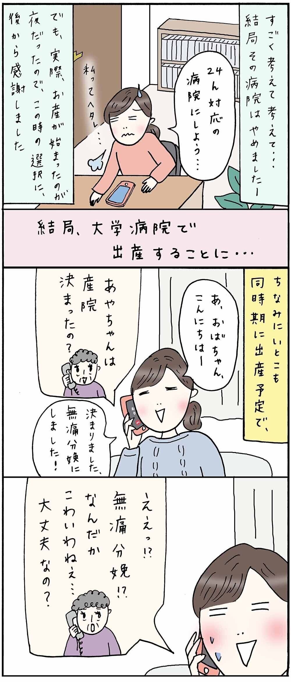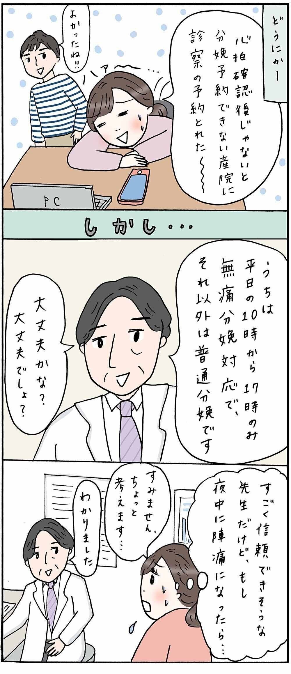漫画にも書きましたが、心拍確認後でないと予約を取れない病院、というのも一定数あって、なんとか予約を取ることができました。大学病院しか取れず、費用が高くなってしまい、そこは想定外でしたが、自分が多く払う、と言って夫を説得しました。笑