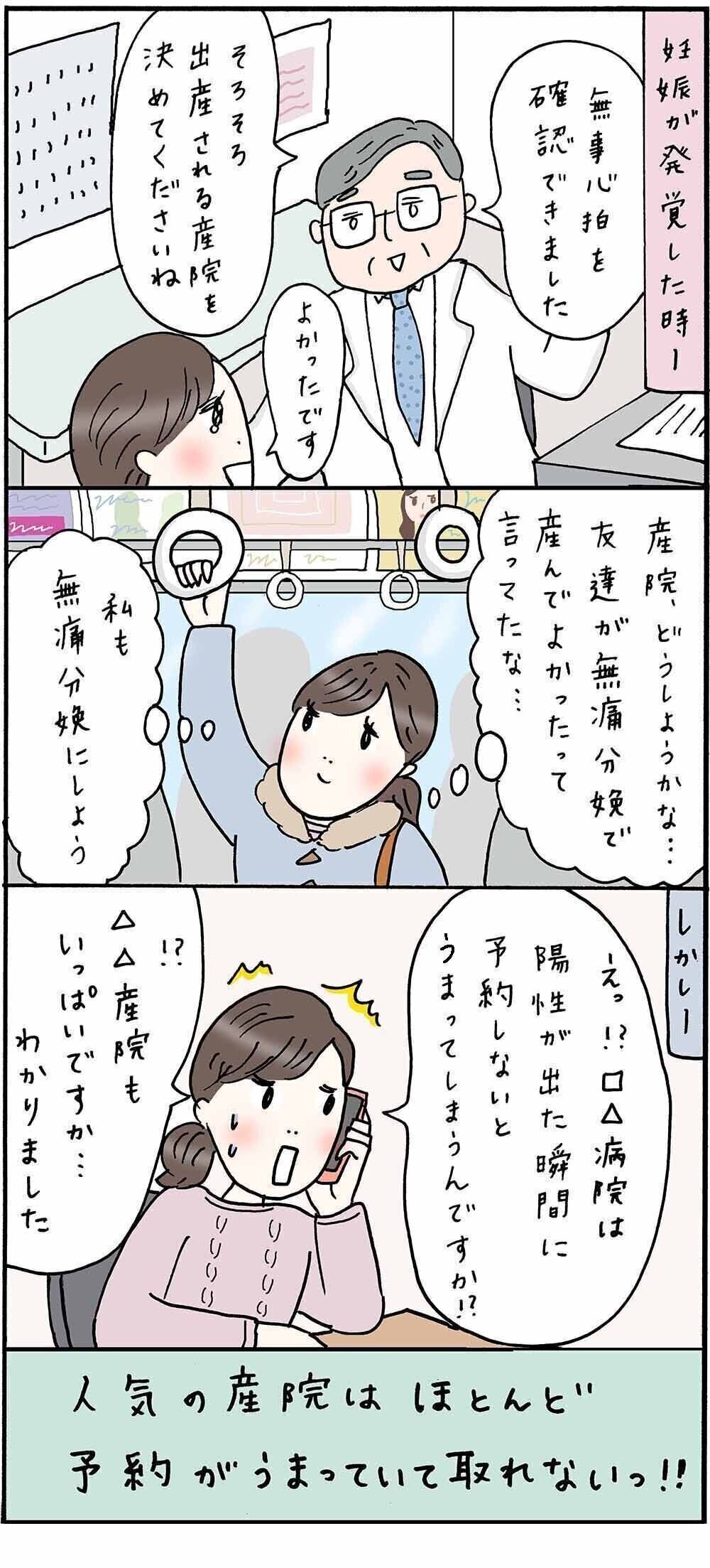 産院を探すまで知らなかったのですが、無痛分娩を実施している産院は数が限られているため、妊娠検査薬で陽性が出た瞬間に予約を入れないと埋まってしまうそうです。全く知らなかったので、完全に出遅れた私は、全然予約が取れなくてかなり焦りました。