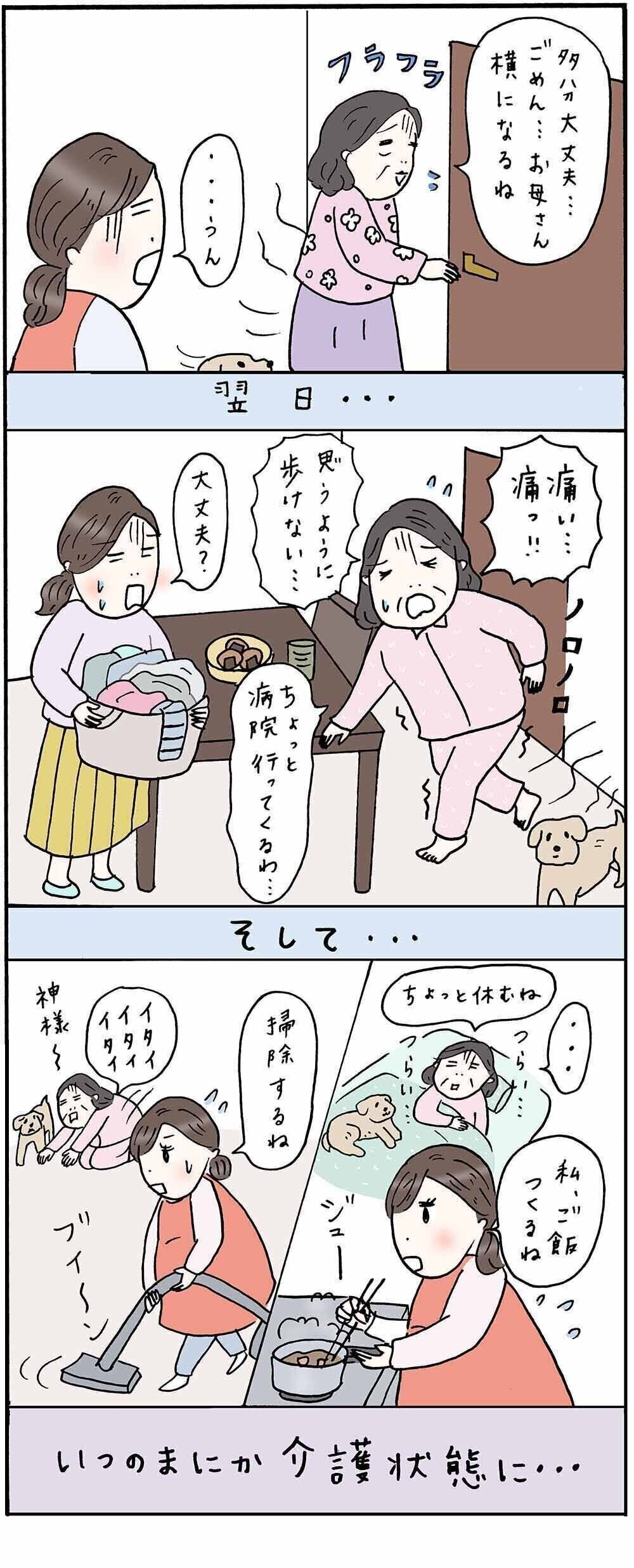 母親が転倒して、膝を強打。骨折はしていなかったのですが、定期的に注射を打って血を抜いてもらったり、立つのも辛そうでした。