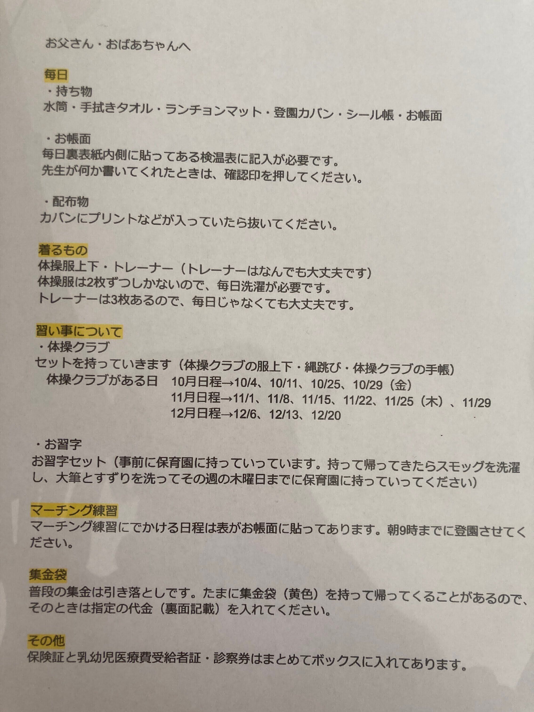 いざ、私が入院することになったとき、上の子のお世話は、夫と近距離に住む義母にお願いすることになっています。また、夫は多忙なため、義母がお世話しやすいように上の子は義母宅で預かってもらうことになっています。夫も義母も日常的に上の子のお世話をしているわけではないので、保育園に毎日何を持っていくのか、いつ習い事があるのかなど、ざっくりとはわかっていても、細かくはわからない状態。そこで、夫と義母宛に保育園と習い事に関する準備品リストを作成しました。