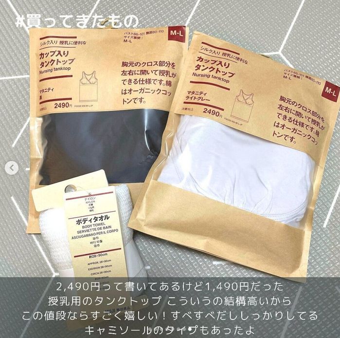 シュシュママさんは「シルク入り 授乳に便利なカップ入りタンクトップ」をセレクト。授乳しやすいデザインになっているそうで、無印良品の店頭で1,490円で買えたとのこと。オーガニックコットン素材も嬉しいですよね。