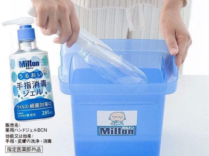 「Milton うるおい手指消毒ジェル」で手指をキレイにしてから専用トングで取り出し、溶液をよく振りきるだけでOK。においが気になる場合は軽くすすいでください。