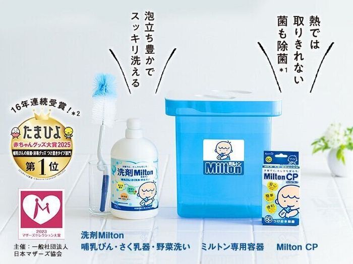 そこでおすすめなのが、洗って浸けるだけで衛生管理ができる「Milton(ミルトン) CP」。「Milton CP」は煮沸や電子レンジなどの熱では取りきれない菌*も、カンタンに取り除いてくれる頼もしいアイテムです。