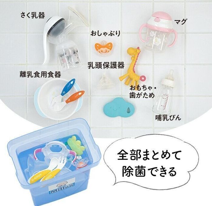 衛生管理が必要なグッズは哺乳びんだけではありません。出産後すぐに使う、たとえばママのさく乳器や乳頭保護器から、赤ちゃんが少し成長したら使う離乳食用食器、マグ、おもちゃなど、成長に合わせていろいろな場面で除菌は必要です。それらを全部まとめて除菌できる便利アイテムが「Milton CP」。必ずといっていいほど使うものなので、出産後にあわてないよう、出産前にそろえておきましょう。