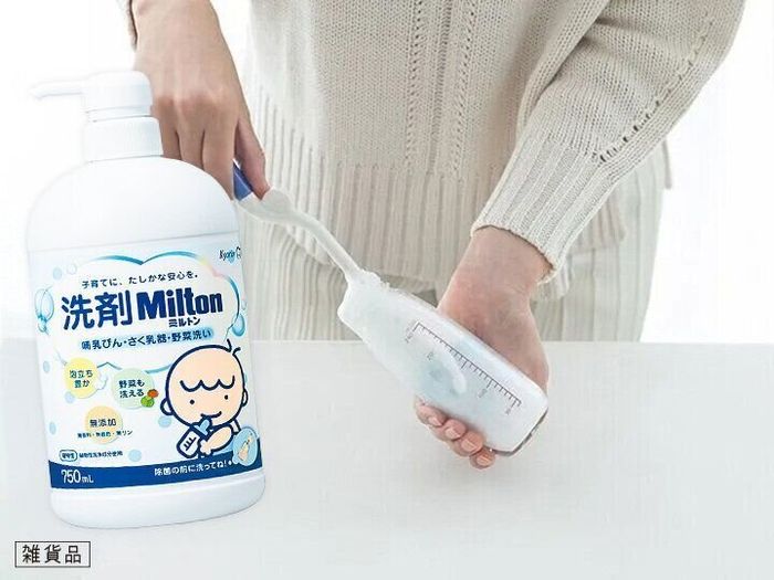 「洗剤Milton 哺乳びん・さく乳器・野菜洗い」で、使ったベビーグッズをしっかり洗ってすすぎます。哺乳びん、さく乳器、マグなどはパーツごとに分けて洗いましょう。
