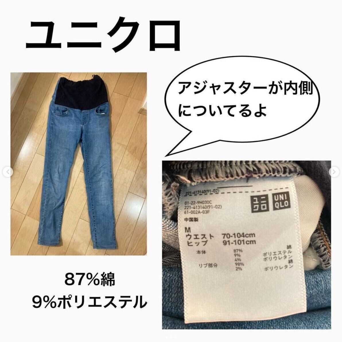 baby_0508__さんは、こちらのマタニティデニムを購入。アジャスターが内側についているのがポイントなんだとか。綿の割合が高く、お肌に優しいのが嬉しいとのこと。楽チンに履けて、細見えしてくれそうなデニムですよね。
