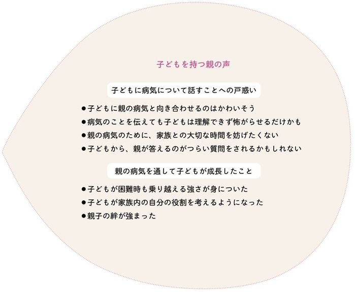 「自分自身ががんと診断され、傷つき戸惑っているため、『同じような思いをわが子にさせたくない』『親の病気の影響を子どもの生活に与えたくない』と思うのは無理もありません。
