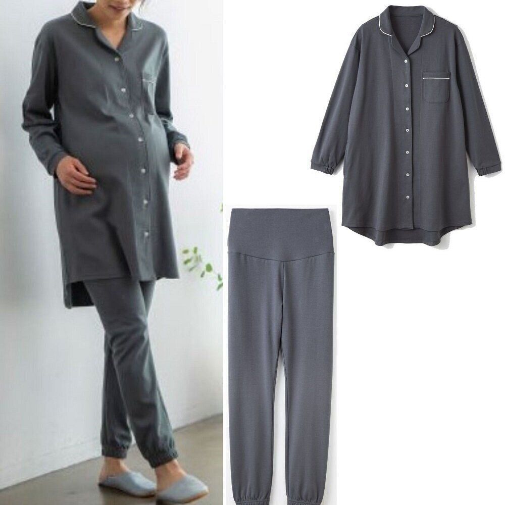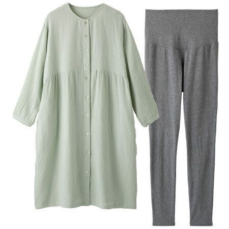 綿100%素材のマタニティ~産後用パジャマ&レギンスセット。暑い季節にうれしいサラッとしたガーゼ素材で、冷房が効いた室内でも活躍する長袖仕様です。