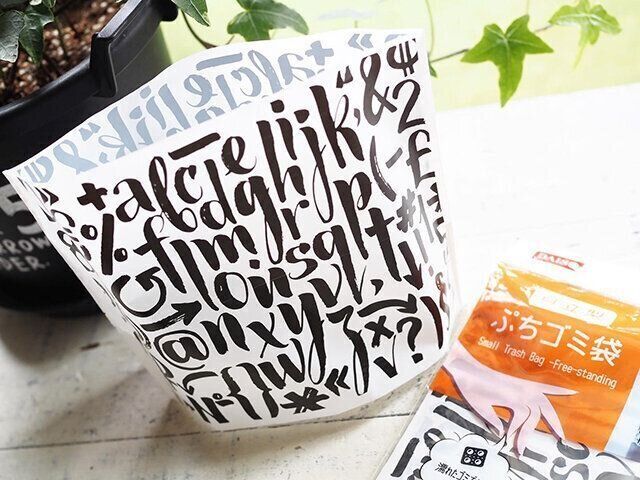 底のマチを広げると、袋だけで自立させることができるのでそのままゴミ箱として使えます♪モノトーンの英字柄もおしゃれで、インテリアにも馴染むヴィジュアルです。