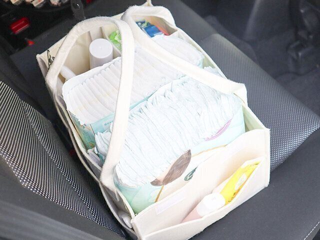 このオムツストッカーはAmazonで購入しましたが、ニトリの「整理用バスケット」やダイソーの「ピクニックバッグ」も度々オムツストッカーに使われています。モノによっては肩に掛けることができたり、ベビーカーの下のカゴに入れることもできるので、産後のライフスタイルに合わせて探してみてくださいね。
