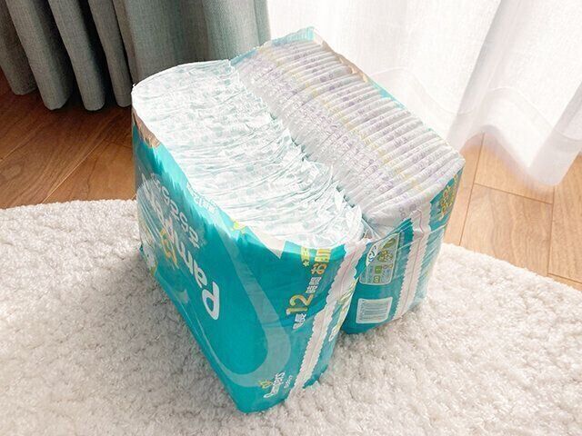 こちらもSNSで話題になったライフハックですが、オムツの包装の真ん中に切れ目を入れ、真っ二つに折るだけでオムツが取り出しやすくなります。急いでいるときはこのままその辺に転がっています……(笑)。わが家では真っ二つにしてオムツストッカーにそのまま収納しています。自分でオムツを詰め込むより時短できますよ。